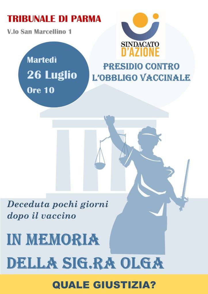 Martedì 26 luglio alle ore 10.00 siete tutti invitati a partecipare al presidio che il Sindacato d’Azione ha organizzato al Tribunale di Parma (vicolo San Marcellino 1) in memoria della sig.ra Olga, obbligata a vaccinarsi contro il suo volere e deceduta pochi giorni dopo. Sarà l’occasione per ricordare anche “gli invisibili”, i danneggiati da vaccino che nessuno vede e nessuno ascolta, così come le tante morti improvvise di questo ultimo anno e mezzo. Vi aspettiamo numerosi!