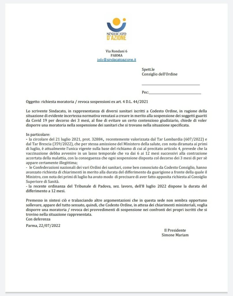 Il Sindacato d’Azione, per conto dei propri iscritti, ha chiesto la revoca – moratoria delle sospensioni dei sanitari