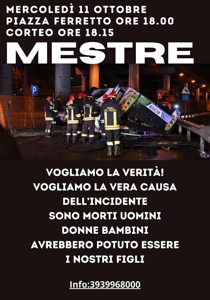 A Mestre, domani alle ore 18 si terrà una manifestazione di solidarietà e per chiedere chiarezza e verità affinché ancora una volta non si tenti di insabbiare questa tragedia che riguarda non solo chi ne è rimasto vittima, ma tutti noi. Infatti ciascuno di noi poteva essere su quell’autobus.