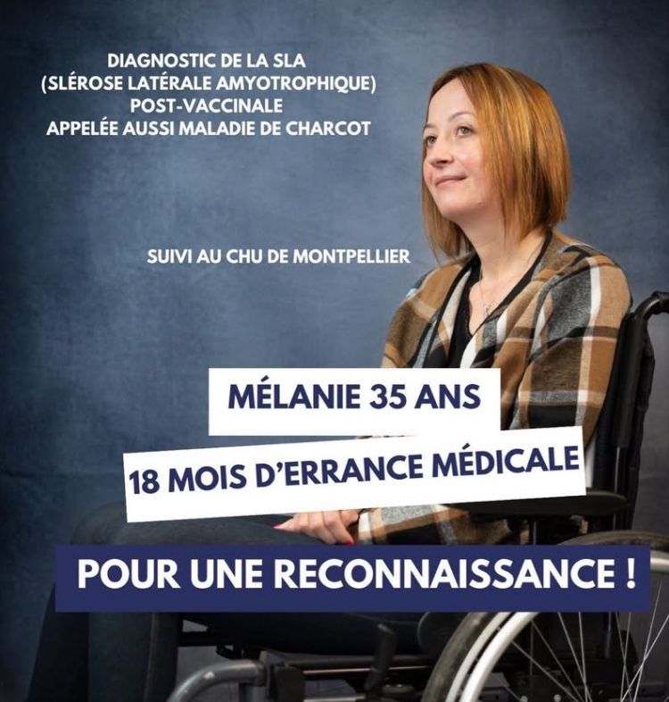 Mélanie era una giovane donna sana e attiva, con una vita piena davanti a sé. Nel giugno 2021, pochi giorni dopo la seconda dose del vaccino anti-Covid, ha iniziato a manifestare i primi sintomi gravi, mai avuti prima. La situazione è peggiorata dopo la terza dose alla fine di gennaio 2022, con perdita di forza, fascicolazioni e difficoltà motorie sempre più evidenti. Nel novembre 2022 le è stata diagnosticata la sclerosi laterale amiotrofica (SLA), che ha progressivamente compromesso la sua autonomia e la parola.